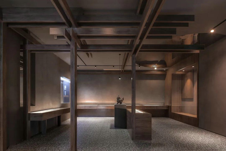 寧靜深邃的氛圍中皎潔的白光,如皓月清暉,遠處影影綽綽的自然光從柵格屏風(fēng)中透入,賦予空間純粹自然的美感。質(zhì)感細膩的深灰色水磨石鋪貼強化了博物館原有的神圣感和莊重感。