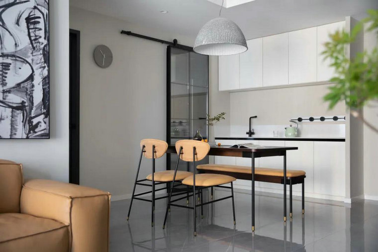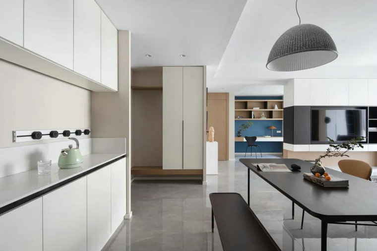 普佩斯淺灰大理石瓷磚貫穿客餐廚空間,雅致純粹的質(zhì)地鋪陳空間的層次感。簡(jiǎn)潔的餐廚空間布置呼應北歐風(fēng)格的生活美學(xué),冷暖色調的平衡營(yíng)造柔和舒適的空間秩序。