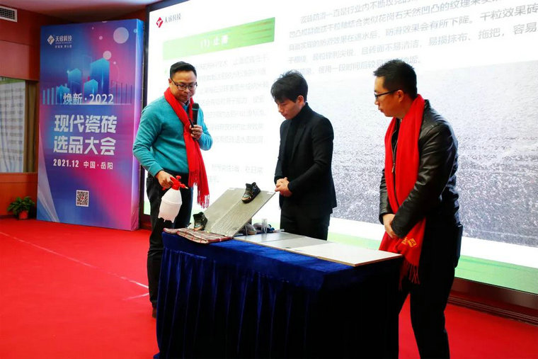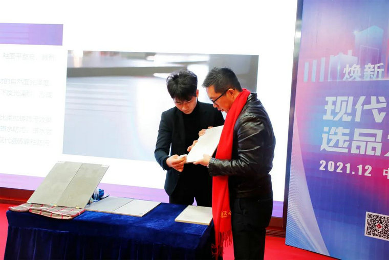 諶總向經(jīng)銷(xiāo)商朋友們隆重發(fā)布金達雅現代瓷磚產(chǎn)品,仔細講解自己和團隊傾注心血的產(chǎn)品,對時(shí)尚美觀(guān)、實(shí)用實(shí)惠、耐磨防污、健康安全的金達雅現代瓷磚充滿(mǎn)信心。